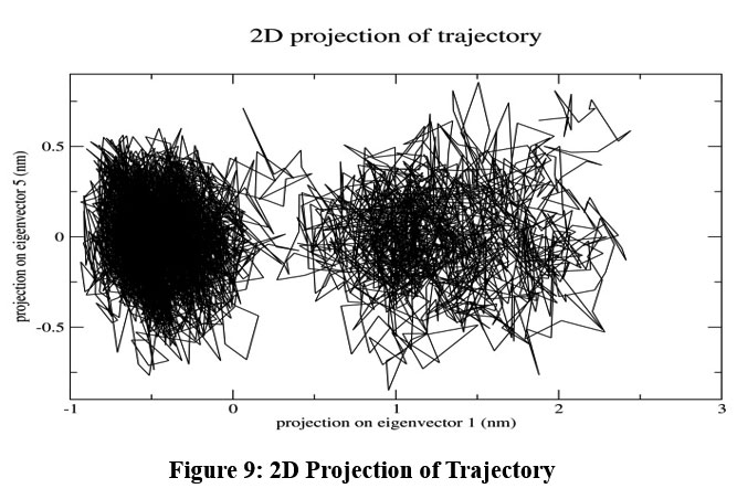The 2D projection of the trajectory ( Fig 9 ), which maps the motion along eigenvectors 1 and 5, demonstrates two distinct clusters, representing stable conformational states sampled during the simulation. The dense clustering within these regions reflects structural stability, while occasional transitions between clusters suggest minor shifts in the protein’s global conformation. This indicates that ligand binding induces significant yet stable conformational adjustments in the protein