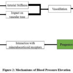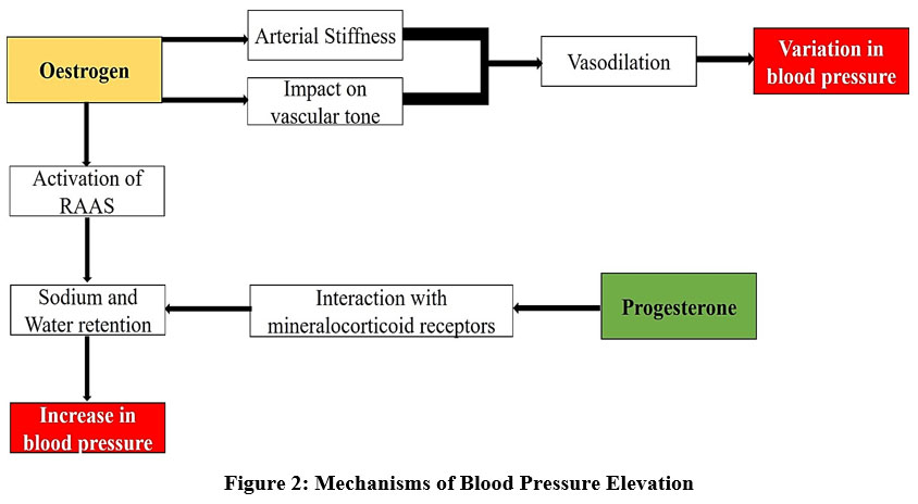 OCs affect hypertension by means of several physiological processes that finally raise blood pressure. The renin-angiotensin-aldosterone system (RAAS) is one of the main processes as it is so important for control of blood pressure and fluid balance (Fig.2)25. Activating RAAS causes sodium and water retention, which helps to explain higher blood volume and hence higher blood pressure. Key hormonal components of OCs, oestrogen and progesterone, also have major effects on blood pressure control. Oestrogen has been linked to the RAAS pathway activation and fluid retention, therefore aggravating hypertension. Furthermore, interacting with the mineralocorticoid receptor, progesterone could cause salt retention and raised blood pressure. These hormonal influences help to explain a general change in cardiovascular performance.26 OCs also affect arterial stiffness, which is another way they impact hypertension. Reduced flexibility of blood arteries resulting from increased arterial stiffness makes it more difficult for the circulatory system to adjust for changes in blood pressure. This change in vascular tone causes reduced vasodilation, which also helps to explain variances in blood pressure. Inappropriate dilating of blood arteries can lead to persistent hypertension, hence raising the risk of cardiovascular problems.27
