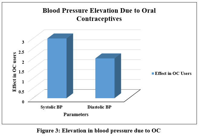 The utilisation of OCs results in a statistically significant elevation in blood pressure relative to non-users. The increase in systolic blood pressure (2-4 mmHg) and diastolic blood pressure (1-3 mmHg) is mostly ascribed to estrogen-induced stimulation of the RAAS, which facilitates sodium retention and fluid overload (Table 2). This indicates that even slight elevations in blood pressure among oral contraceptive users may elevate the long-term risk of hypertension, especially in vulnerable individuals (Fig.3).29,30