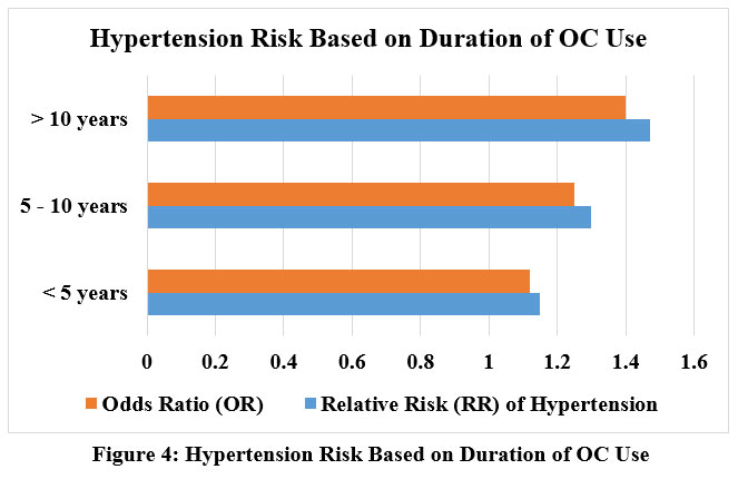 Prolonged usage of OCs is associated with an escalating risk of hypertension. Studies indicate a 15% increase in risk for users under 5 years and up to 47% increased risk in users exceeding 10 years (Table 3). This substantiates the notion that extended exposure to synthetic oestrogen and progestin may provoke vascular alterations and elevate blood pressure, highlighting the necessity for routine blood pressure monitoring in long-term users (Fig.4).31,32