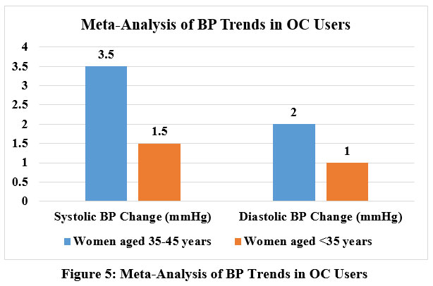 Older women show higher blood pressure rises than younger women, which supports age-specific contraceptive prescriptions. Meta-analysis studies repeatedly linked long-term OC usage to rises in both systolic and diastolic blood pressure (Table 6 & Fig.5).36-37