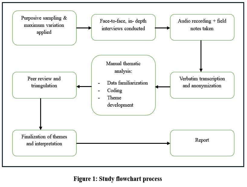 This method encompassed several critical stages: data familiarization, open coding, categorization of codes into overarching themes, and the formulation of final themes and subthemes.21All coding and theme development were performed manually by the researcher using printed transcripts and structured coding sheets, in line with Braun & Clarke’s six-phase framework for thematic analysis. The researcher did the coding, which was subsequently verified by a secondary researcher to strengthen the legitimacy and consistency of the findings. Disputes over coding or theme development were settled by dialogue and consensus. Field notes were utilized to enhance contextual comprehension and interpretation of the data. To ensure trustworthiness and rigor, the study followed to Guba and Lincoln’s standards for qualitative research in generating credibility, transferability, dependability, and confirmability.22 A flowchart detailing the study procedure is provided in Figure 1.