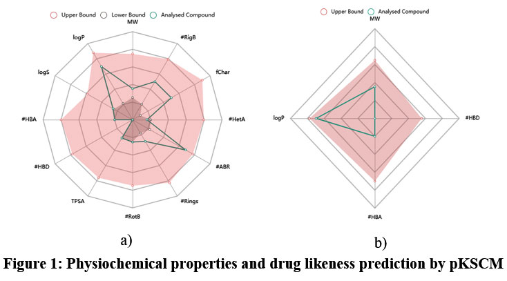 The virtual prediction technique was used to ascertain the lead molecule’s physicochemical characteristics. Molinspiration to assess its drug-likeness characteristics and Lipinski’s Rule of 5 and PkCSM to assess its toxicity. Toxicity was also assessed by toxtree to determine the toxicity class.
