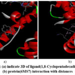 The compound 1,8-Cyclopentadecadiyne was shown to be deeply buried in the 2J6M active site, as demonstrated by the molecular docking analysis. An alkyl interaction was identified, indicating the drug’s increased stability and affinity for binding through the receptor. The protein 2J6M’s amino acid PHE 910 and the ligand form a single alkyl bond that is 4.45 Å. Fig 5a indicate 3D of ligand and protein (PDB ID: 2J6M) complex with distances and Fig 5b represents the 2D interaction of the complex.