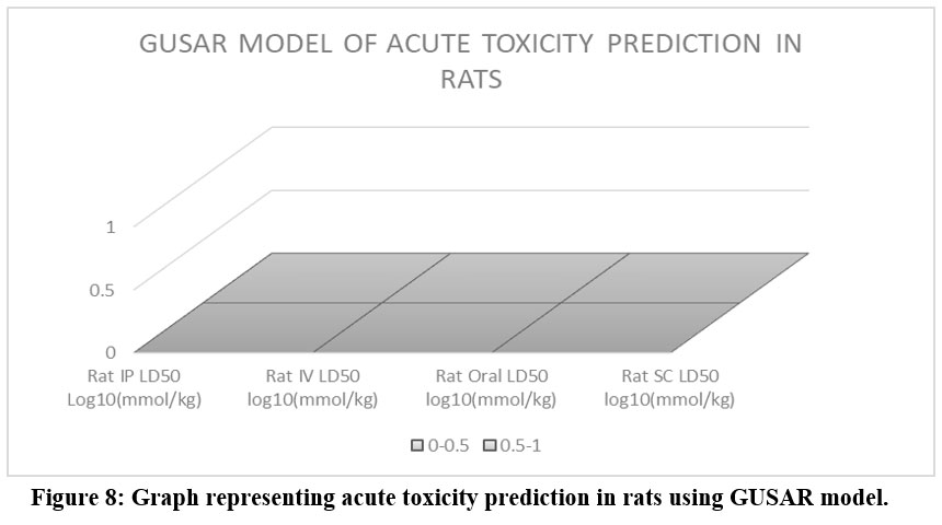 The Generally Unrestricted Structure Activity Relationship (GUSAR) model for acute rat toxicity was employed to forecast the LD50 values for each lead molecule delivered by subcutaneous (SC), intraperitoneal (IP), oral, and intramuscular (IV) routes.Fig 8 graph represents acute toxicity prediction in rats using GUSAR model.