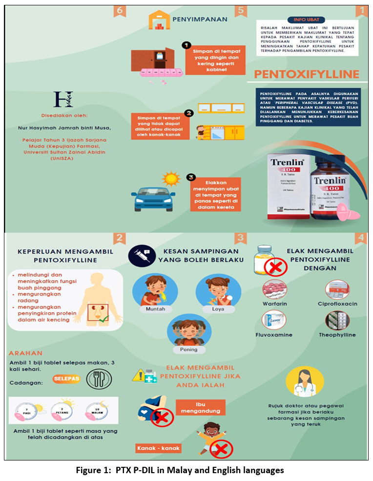 The leaflet was produced using Canva and followed the Human Use Medicinal Product Labeling and Package Leaflet Readability Guideline (Commission, 2009). The leaflet was produced in Malay and English because these languages are widely spoken among the Malaysian population.