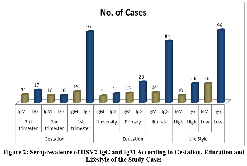 Figure 2: Seroprevalence of HSV2-IgG and IgM According to Gestation, Education and Lifestyle of the Study Cases. |