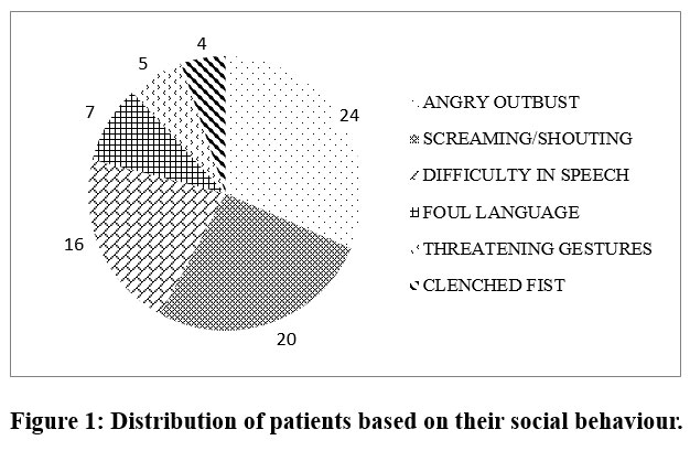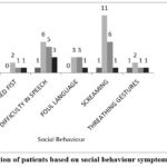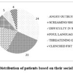 The data in fig 1 displays the prevalence of various changes in social behaviour pattern like angry outburst, screaming/shouting, difficulty in speech, foul language, threatening gestures and clenched fists reported by the patient. 76% of the subjects experienced changes in social behaviour. The highest were angry outbursts reported by 24% of patients and the lowest were clenched fists represented by 4%. These changes can severely affect a patient’s social support system and contribute to overall distress.