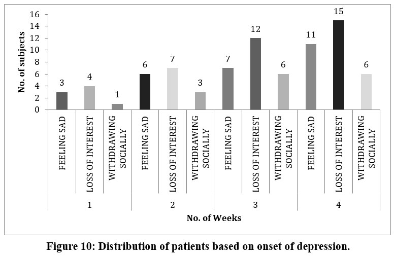 In our study, while observing depression symptoms in patients undergoing epileptic therapy with levetiracetam, it was noted that depressive symptoms became more prominent over time. The Figure 10 represents the distribution of patients based on onset of depression. The data suggests a significant correlation between prolonged (4weeks) levetiracetam use and the onset of depressive symptoms.