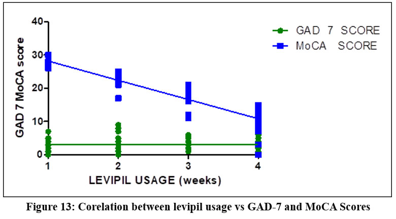 The Figure 13 represents the Corelation between levipil usage vs GAD-7 and MoCA Scores.