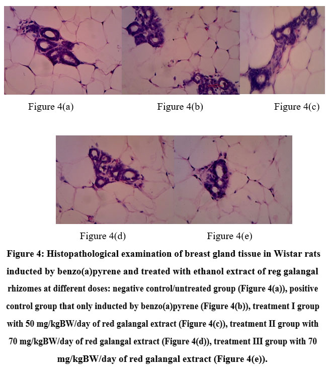 According to previous studies, benzopyrene is a compound belonging to the same class as benzo[a]pyrene, namely polycyclic aromatic hydrocarbons (PAHs) was used to induce breast cancer in mice. The induction was carried out for 14 days in group B (treatment I: induction and breast excision) and group C (treatment II: induction and administration of red galangal extract at dose of 4.5 mg/head/day). This treatment caused cuboidal  epithelial hyperplasia in the lactiferous ducts, resulting in thickened ductal walls composed of more than four layers of epithelial cells. Furthermore, induction with benzo[a]pyrene resulted in the death of three mice, which was attributed to improper administration during the gavage process, leading the compound to enter an incorrect physiological pathway.26
