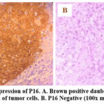 Figure 1: Overexpression of P16. A. Brown positive daubed in the nucleus and cytoplasm of tumor cells. B. P16 Negative (100x magnification). |