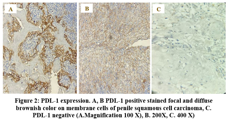 Figure 2: PDL-1 expression. A, B PDL-1 positive stained focal and diffuse brownish color on membrane cells of penile squamous cell carcinoma, C. PDL-1 negative (A.Magnification 100 X), B. 200X, C. 400 X). |