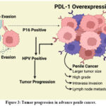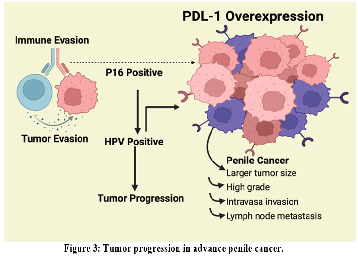Persistent HPV infection acts as a critical driver in the pathogenesis of several cancers, primarily via the induction of an immunosuppressive tumor microenvironment. HPV’s E5 oncoprotein has been reported to stimulate epidermal growth factor receptor (EGFR) activation, subsequently resulting in increased PD-L1 expression on malignant cells. This process permits tumor cells to evade immune detection by inducing apoptosis in T-cells, consequently undermining the robustness of the anti-tumor immune response and diminishing the host’s immunological control over malignant cells.13 Elevated PD-L1 levels are frequently observed in HPV-positive squamous cell carcinomas and are closely linked with HPV related malignancies.14 High risk HPV varieties are recognized carcinogens for penile cancer, and strong p16 immunostaining is a dependable indicator of active infection with HPV.15,16 Furthermore, p16 overexpression stems from the disruption of retinoblastoma (Rb) protein function by the HPV E7 oncoprotein, leading to altered cell cycle regulation and facilitating tumorigenesis.17