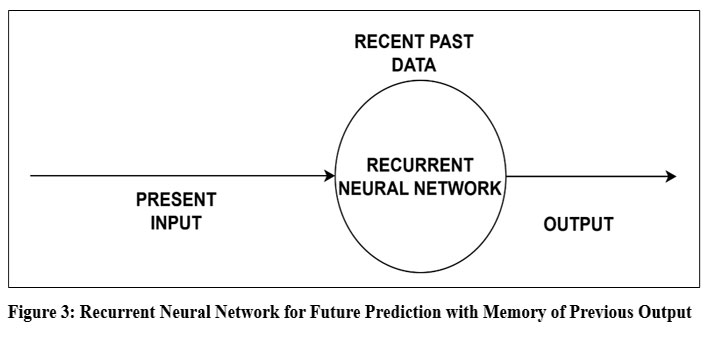 Recurrent neural networks, or RNNs, are inspired by the human brain’s working memory, namely the constant neuronal activity in regions like the hippocampus, neocortex, and prefrontal cortex. Unlike feed-forward networks, which only use current inputs, RNNs process sequential data and produce context-aware predictions by using feedback loops to retain prior outputs in an internal memory. Standard RNNs, however, are only capable of short-term memory. Long Short-Term Memory (LSTM) networks were created to solve this problem. These networks use specialized memory cells and three different kinds of gates—input, output, and forget—that control the flow, retention, and disposal of data. Because of these improvements, LSTMs can capture long-term dependencies, which makes them useful for tasks like text summarization, video classification, and speech recognition. The midbrain attention network circuit architecture of the brain serves as an inspiration for the construction of RNNs and LSTMs. Recurrent neural network for future prediction with memory of previous output is explained in Fig 3.