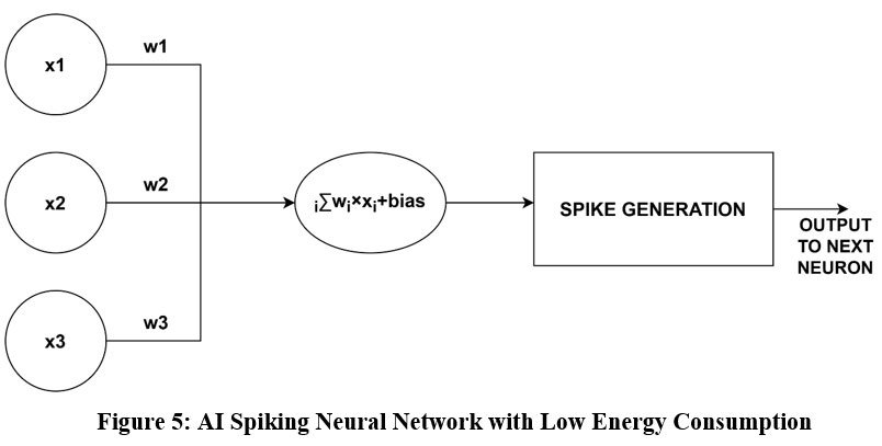 Although DNNs have made great strides in text, voice, and image recognition possible, their high processing overhead makes them less appropriate for situations with limited resources, such as edge devices. SNNs, which are modelled after biological neurons that only send messages when their membrane potential over a specific threshold, are being developed as a remedy. Like this, neurons in SNNs only “spike” or fire when they cross this threshold, as opposed to standard DNNs, which transmit signals continuously. SNNs are a possible substitute for modeling sophisticated information processing in energy-constrained settings because of their event-driven mechanism, which also makes them more energy-efficient and appropriate for low-power applications. Fig 5 represents the energy efficient spiking neural network.