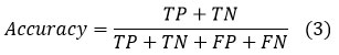 With regard to classification problems, the most common metric that is used in machine learning and deep learning domains is accuracy. It is possible to describe it in a concise manner as the percentage of occurrences that were properly predicted out of the total number of instances, which includes both accurate and inaccurate forecasts. Regarding the four previously described prediction situations, the equation for accuracy may be formulated as follows: