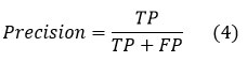 Precision is an important parameter in classification tasks, particularly when the goal is to minimize false positive predictions. The percentage of genuine positive predictions and overall positive predictions that the model makes is what is meant to be understood by this proportion. The precision equation is written as follows in terms of the four prediction cases previously mentioned: