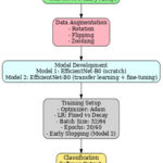 The architecture of Model 1 comprises a total of 4,054,695 parameters, out of which 4,012,672 are trainable, while 42,023 are non-trainable. The model is constructed using the EfficientNet-B0 backbone and includes an additional input layer that accepts images with a resolution of 224 × 224 × 3. In total, the model contains 238 layers, where 237 layers originate from the default EfficientNet-B0 architecture, and the remaining layer corresponds to the custom input layer. This configuration highlights that Model 1 is a straightforward architecture, designed to learn features directly from the training data without relying on any pre-trained weights, thereby enabling an unbiased evaluation of the model’s performance when trained from scratch.