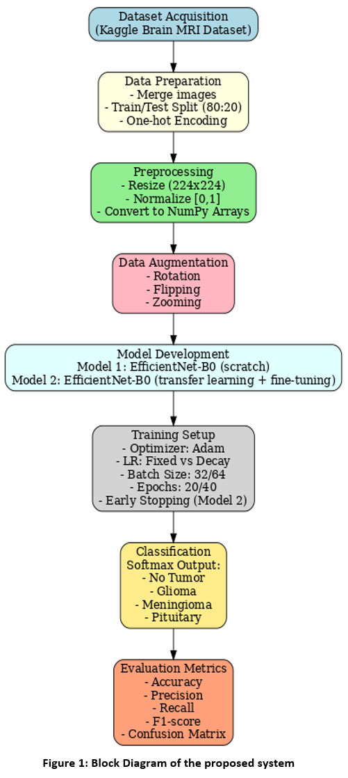 Figure 1 illustrates the automated workflow for brain tumour classification using MRI images and deep learning. The process begins with the acquisition of MRI images, which serve as the input data for the system. These images are then passed through a preprocessing stage where they are resized, normalized, and one-hot encoded to ensure consistency and compatibility with the deep learning model. Following this, the preprocessed images are fed into the EfficientNet-B0 model, a pre-trained convolutional neural network utilized for feature extraction. This model captures relevant features from the images through transfer learning, enabling effective classification with minimal training data. The extracted features are then processed through a classification layer that assigns each image to one of the predefined tumour categories. Finally, the system outputs the predicted brain tumour type—glioma, meningioma, or pituitary tumour—facilitating early and accurate diagnosis to support clinical decision-making.
