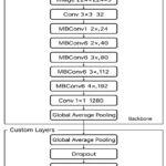 Figure 2 describes the general structure of the EfficientNet-B0-based model that will be used in the proposed work. This architecture can be subdivided into two primary components: the backbone network and the custom classification layers. The main structure consists of the standard EfficientNet-B0 model, which starts with an input layer that takes the size of 224 × 224 × 3 of MRI images. This is succeeded by a first convolutional block and a series of Mobile Inverted Bottleneck Convolution (MBConv) blocks of different expansion factors and output channels that allow efficient feature extraction at multiple scales. A global average pooling operation is then followed by the backbone with a 1 × 1 convolution layer, yielding small and discriminative features. The final dense layer uses the softmax activation function to assign probabilities to each class. For an input feature vector z, the probability of class i is given by: