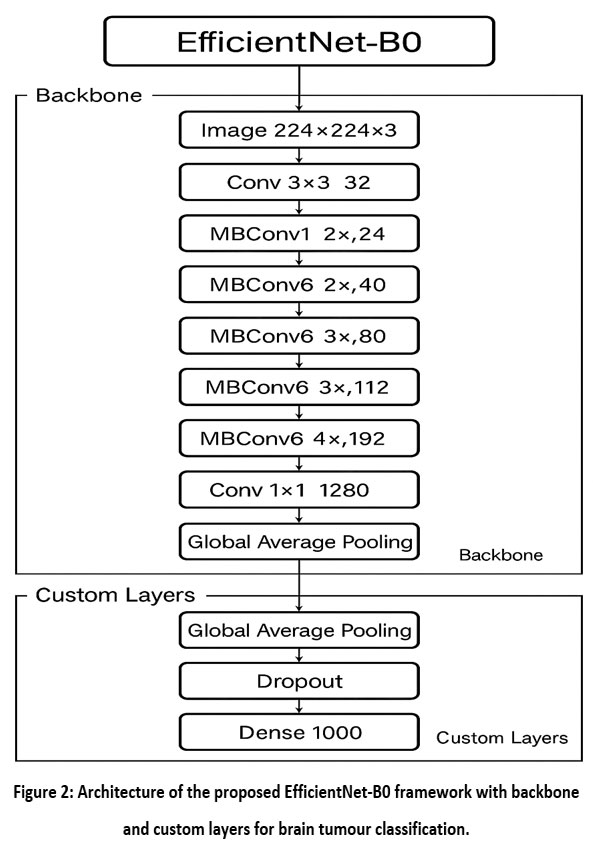 Figure 2: Architecture of the proposed EfficientNet-B0 framework with backbone and custom layers for brain tumour classification.Click here to view Figure