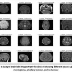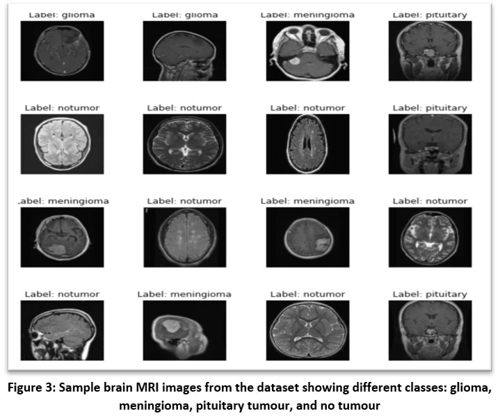 Figure 3 above presents a grid of sample brain MRI images representing the four classes used in the classification task: glioma, meningioma, pituitary tumour, and no tumour. These images visually demonstrate the diversity in tumour appearance, anatomical location, and scan orientation. Each image is labeled according to its ground truth class, providing insights into the morphological characteristics that distinguish each category. For instance, glioma and meningioma can be seen with irregular masses in different brain regions, while pituitary tumours are located near the base of the brain. The “no tumour” images exhibit normal brain structures without any visible abnormalities. This visualization emphasizes the complexity of tumour detection and the necessity for automated feature extraction techniques, such as those employed in the EfficientNet-B0-based models, to accurately differentiate between subtle pathological features.