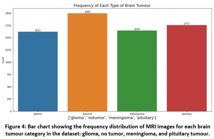 Figure 4: Bar chart showing the frequency distribution of MRI images for each brain tumour category in the dataset: glioma, no tumor, meningioma, and pituitary tumour.Click here to view Figure
