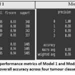 Figure 7: Comparative performance metrics of Model 1 and Model 2 based on precision, recall, F1-score, and overall accuracy across four tumour classes on the test dataset.Click here to view Figure