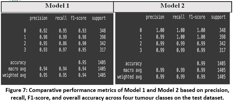 Figure 7 provides a detailed comparison of the classification performance of Model 1 and Model 2 using standard evaluation metrics—precision, recall, F1-score, and overall accuracy—on a test set of 1,405 MRI images across four classes. Model 1, trained from scratch without transfer learning, achieved a commendable overall accuracy of 95%, with macro and weighted average F1-scores of 0.94. While its class-wise performance is strong, slight inconsistencies are observed in the classification of class 2 (meningioma), where the recall drops to 0.86, indicating some false negatives. In contrast, Model 2, which incorporates transfer learning using EfficientNet-B0 with pre-trained weights and fine-tuning, demonstrates superior performance. It achieves an impressive overall accuracy of 99%, with a perfect precision, recall, and F1-score of 1.00 for class 0 (no tumour), and near-perfect scores for all other classes. The macro and weighted average scores of 0.99 further confirm the model’s robust and balanced performance across all classes. These results clearly highlight the effectiveness of incorporating transfer learning and architectural enhancements in improving classification accuracy, consistency, and reliability, making Model 2 more suitable for clinical-grade brain tumour diagnosis.