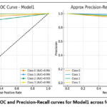 Figure 9a shows the Receiver Operating Characteristic (ROC) and Precision-Recall (PR) meaning of Model2 with four classes. All four classes have an AUC of 1.00 in the ROC curves (left panel), the curves hugging the upper-left corner of the plot. That shows that Model2 has exactly the best separation of positive and negative instances per class with no trade-off between sensitivity and specificity. Also, the PR curves (right panel) indicate that Model2 would achieve a precision and recall value of about 1.0 in all the classes, giving almost perfect step-like curves. This means that the model does not falsely predict a false positive or false negative and will always be accurate in classifying the correct classes. The combination of the ROC curve and PR curve reveals that Model2 has achieved maximum performance in all four classes, which is much better compared to that of Model1, in that all four classes are devoid of performance variation.