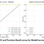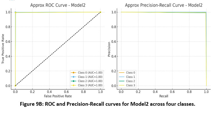 Based on Figures 8 and 9, when comparing Model 1 and Model 2, it is evident that there is a performance improvement. Model1 produced good classification performance, with ROC-AUC values of 0.93 to 0.99 across 4 classes, and reliably high precision-recall trade-offs. Nonetheless, some differences were found, especially Class 2, which had slightly lower performance than the other classes. On the contrary, Model2 was found to have perfect Classification, with ROC-AUC of 1.00, and that of precision-recall being almost ideal in all the classes. This implies that besides the performance differences experienced with Model 1, Model 2 has no such differences and is therefore absolutely reliable in all the classes, making it a better model.