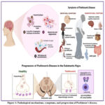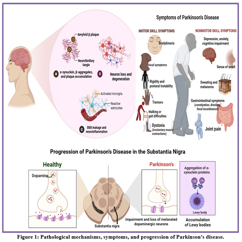 Figure 1: Pathological mechanisms, symptoms, and progression of Parkinson’s disease. |