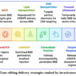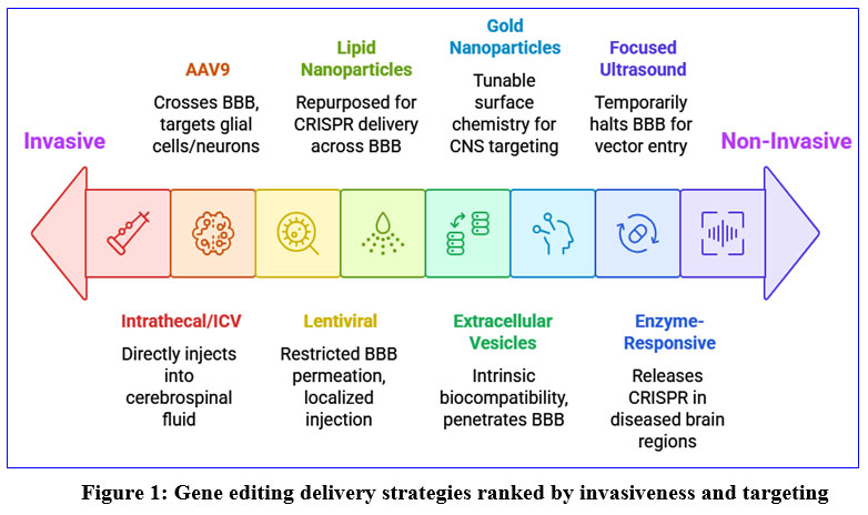 Non-viral delivery systems have emerged as the more advantageous and secure alternatives to the existing and more elastic system of CNS gene delivery. mRNA-based vaccines delivered by lipid nanoparticles (LNPs) have been especially influenced by advances in other systems; LNPs are being repurposed to assist CRISPR delivery across the BBB, in particular combined with use of targeting ligands or targeted changes on the surface.32 The naturally occurring extracellular vesicles, the so-called exosomes are a promising vehicle since they have an intrinsic biocompatibility and can penetrate the blood-brain-barrier (BBB) and carry Cas9 mRNA, protein or ribonucleoprotein complexes.33 Other nanomaterials such as gold nanoparticles and dendrimers provide structural versatility and tunable surface chemistry for CNS-targeted delivery, although they remain largely in the preclinical stage (Figure 1).