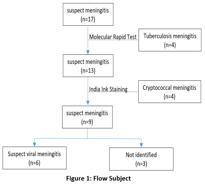 Based on cerebrospinal fluid (CSF) examination results. The causative pathogens of meningitis may include Mycobacterium tuberculosis, Cryptococcus fungi, and suspected viruses. Suspected viral meningitis cases accounted for 6 out of 17 total cases (35.29%) based on physical examination (colour, clarity, and count of cells), elevated mononuclear (MN) or lymphocyte cell counts, and biochemical examination (normal or slightly elevated CSF protein levels, and normal CSF glucose levels)