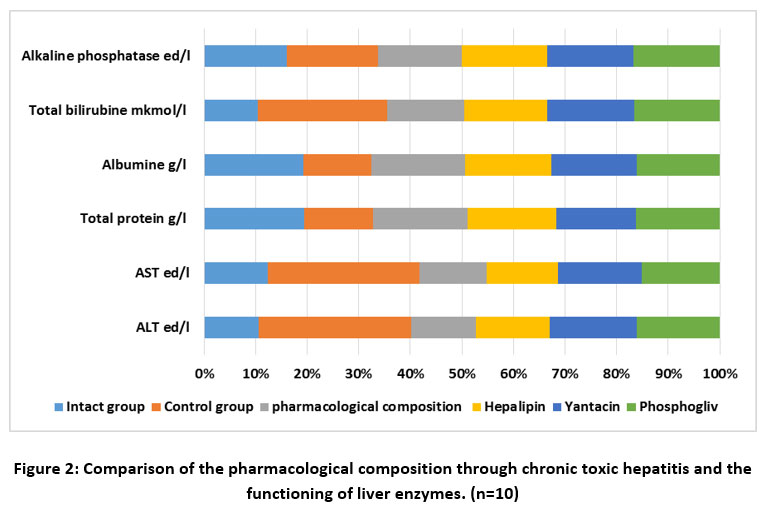Figure 2: Comparison of the pharmacological composition through chronic toxic hepatitis and the functioning of liver enzymes. (n=10) |