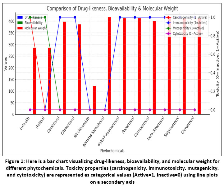 Figure 1: Here is a bar chart visualizing drug-likeness, bioavailability, and molecular weight for different phytochemicals. |