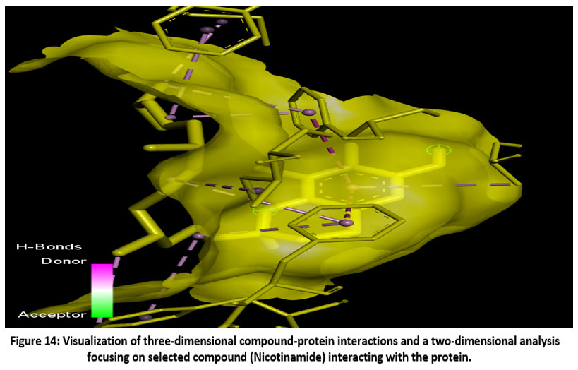Figure 14: Visualization of three-dimensional compound-protein interactions and a two-dimensional analysis focusing on selected compound (Nicotinamide) interacting with the protein. Click here to view Figure |