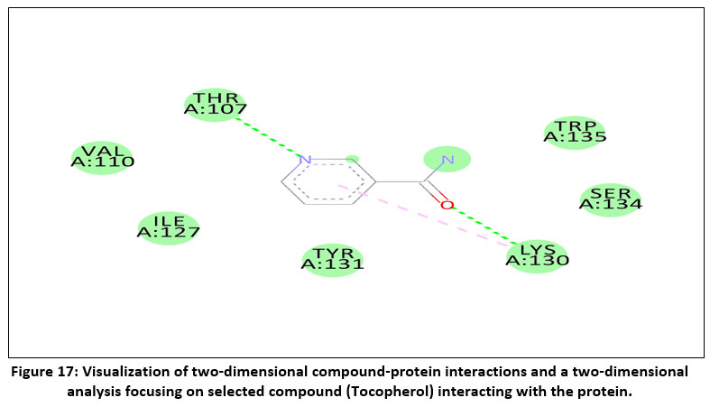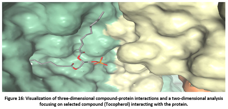 Figure 16: Visualization of three-dimensional compound-protein interactions and a two-dimensional analysis focusing on selected compound (Tocopherol) interacting with the protein. Click here to view Figure |