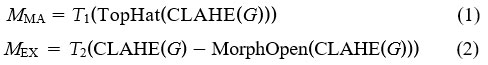 Here, T1 and T2 represent adaptive thresholding functions, and TopHat is a morphological transform to accentuate bright regions.