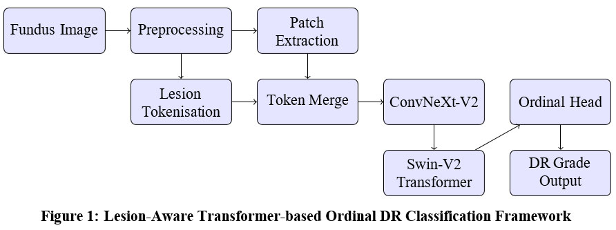 In this section, we explain our proposed method for diabetic retinopathy (DR) classification using a transformer-based ordinal regression model with lesion-aware representation. The design is modular and consists of three major stages: preprocessing and lesion map tokenisation, hybrid ConvNeXt-V2 with Swin-V2 transformer backbone, and a cumulative ordinal regression head for ordered DR grade prediction. We also integrate probability calibration and generate lesion-conditioned visual attention maps. This section includes all important mathematical formulations and system steps.