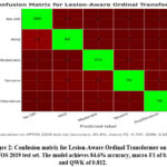 Table 1 shows the performance of our full model against the baseline EfficientNet-B3 (trained with cross-entropy loss) and a Swin-V2 model without lesion tokens or ordinal loss.