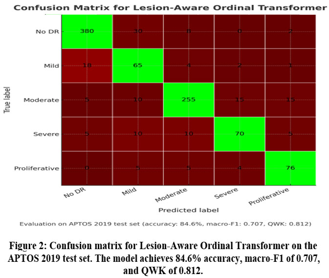 We present a lesion-aware ordinal transformer for five-class DR grading on APTOS 2019. The method integrates lesion tokens, a ConvNeXt-V2,+,Swin-V2 backbone, and cumulative ordinal loss to respect grade order.
