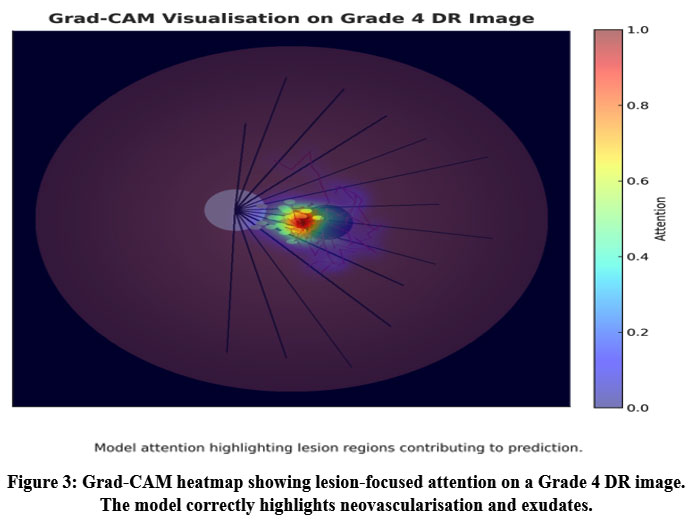Figure 3: Grad-CAM heatmap showing lesion-focused attention on a Grade 4 DR image. The model correctly highlights neovascularisation and exudates.