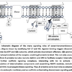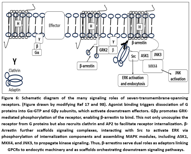 Figure 6: The many signaling roles of seven-transmembrane-spanning receptors. (Figure drawn by SR). Agonist binding triggers dissociation of G proteins into Gα-GTP and Gβγ subunits, which activate downstream effectors. |