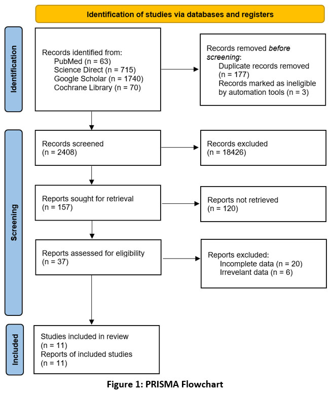 3688 publications from four online databases (PubMed, ScienceDirect, Google Scholar, and Cochrane) were found during the study search process. Using computer software (Citation Manager), duplicates were eliminated, yielding 2408 papers. 37 publications that could be accessed and subsequently evaluated for eligibility were found through the title and abstract screening process. Additionally, 11 included papers were used for both qualitative (systematic review) and quantitative (meta-analysis) analysis after 26 articles were eliminated due to incomplete or irrelevant data. The following is a description of the PRISMA guideline-based study search flow (Figure 1).