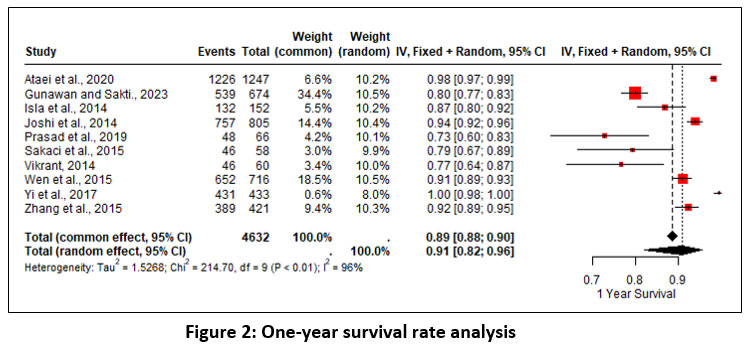 The analysis of survival rates at 1 year included 10 studies, where the overall survival rate was 91% (random effect; 95% CI 82 – 96%; heterogeneity; 𝜏2 <0.01; I2 = 96%) (Figure 2).