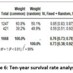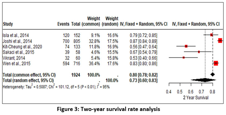 To determine the overall survival rate from all included studies, a quantitative analysis was carried out. According to data obtained from the inclusion study, the analysis was carried out using a number of time durations, including 1, 2, 3, 5, and 10 years.