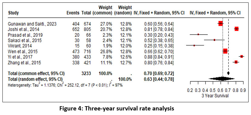 Survival rates at 3 years analysis encompassed 8 studies and the overall survival rate result was 63% (random effect; 95% CI 44 – 78%; heterogeneity; 𝜏2 <0.01; I2 = 97%) (Figure 4).