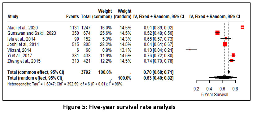 7 studies were pooled and analyzed for the 5-year survival rates, which resulted in a 63% of overall survival rate (random effect; 95% CI 40 – 82%; heterogeneity; 𝜏2 <0.01; I2 = 98%) (Figure 5).